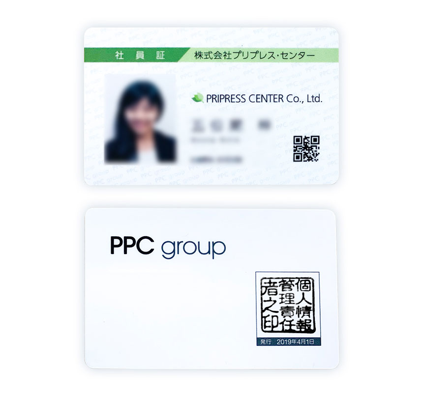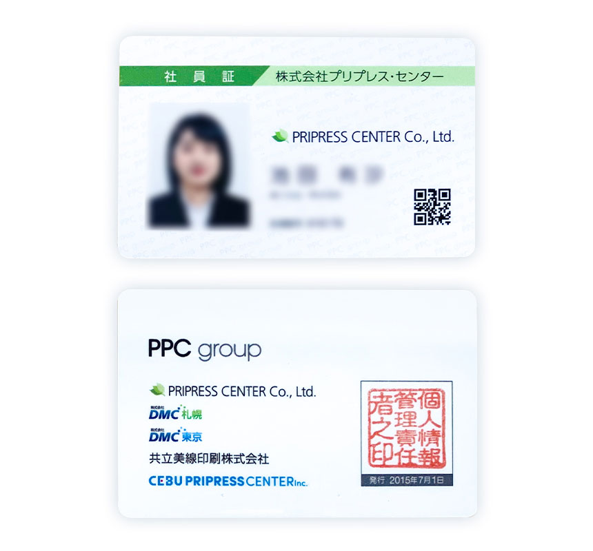 紐色はお客様のコーポレートカラー、さらにロゴをかたどったPVCパーツでオリジナリティ溢れるネックストラップに仕上がっております。安全パーツや長さ調整パーツといったオプションのカスタマイズで、機能性も抜群です。社員証の製作サービスもご利用いただきました。