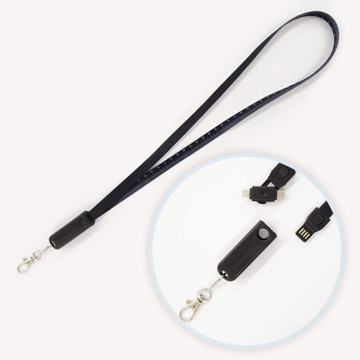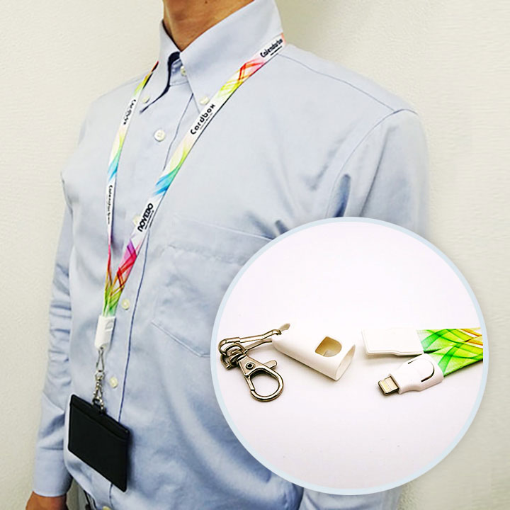 ネックストラップと充電用ケーブルが一体化!パソコンなどのUSBポートに繋ぐとスマートフォンを充電できます。